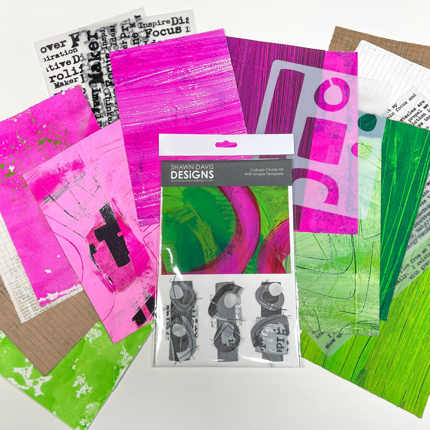 Collage Cluster Kit with Shape Template | Mixed Media Paper Ephemera for Junk Journals, Scrapbooking and Papercrafts, Lime and Pink