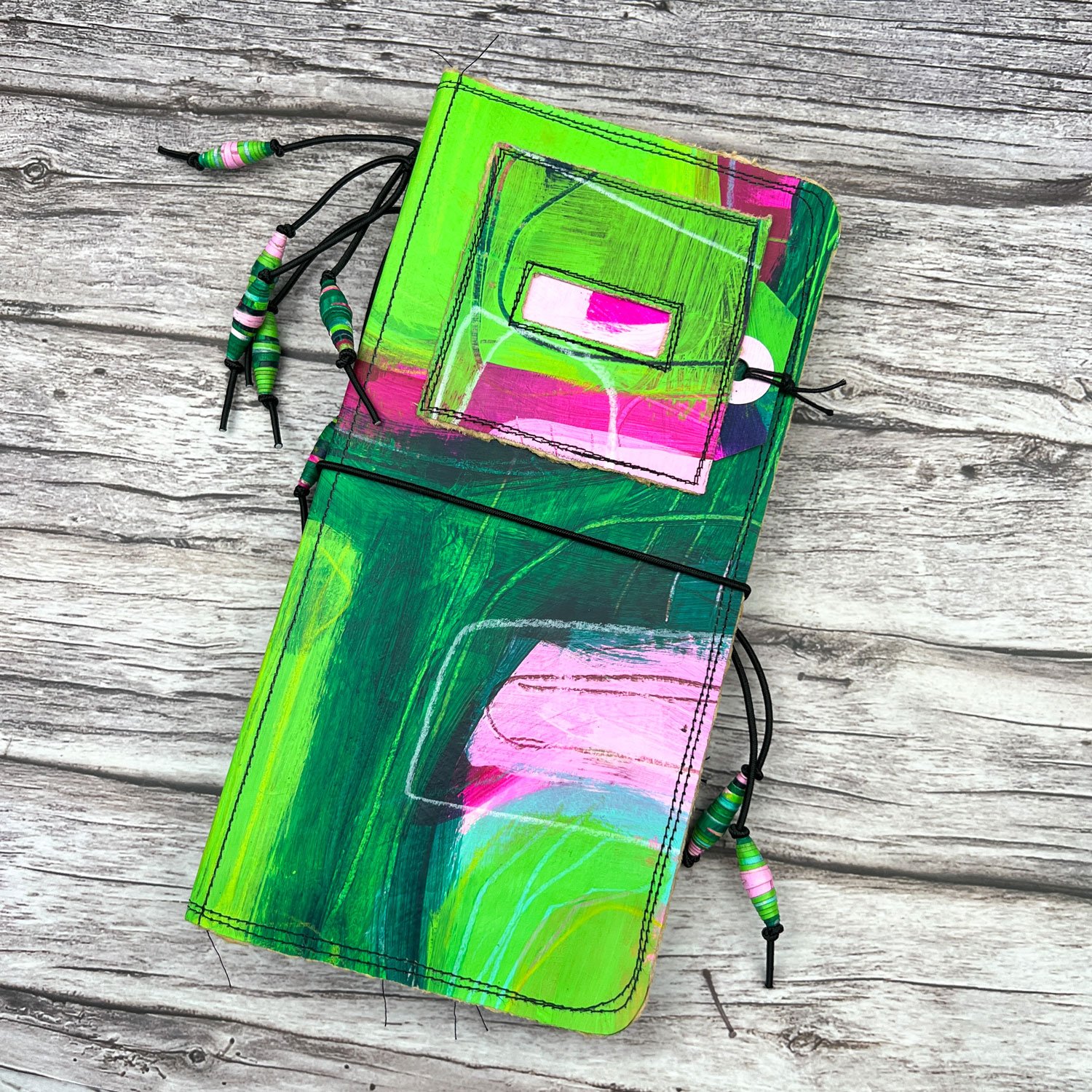 Handcrafted Travel Size Journal with Beads, Distressed Layers, Elastic Bound, Lime and Pink