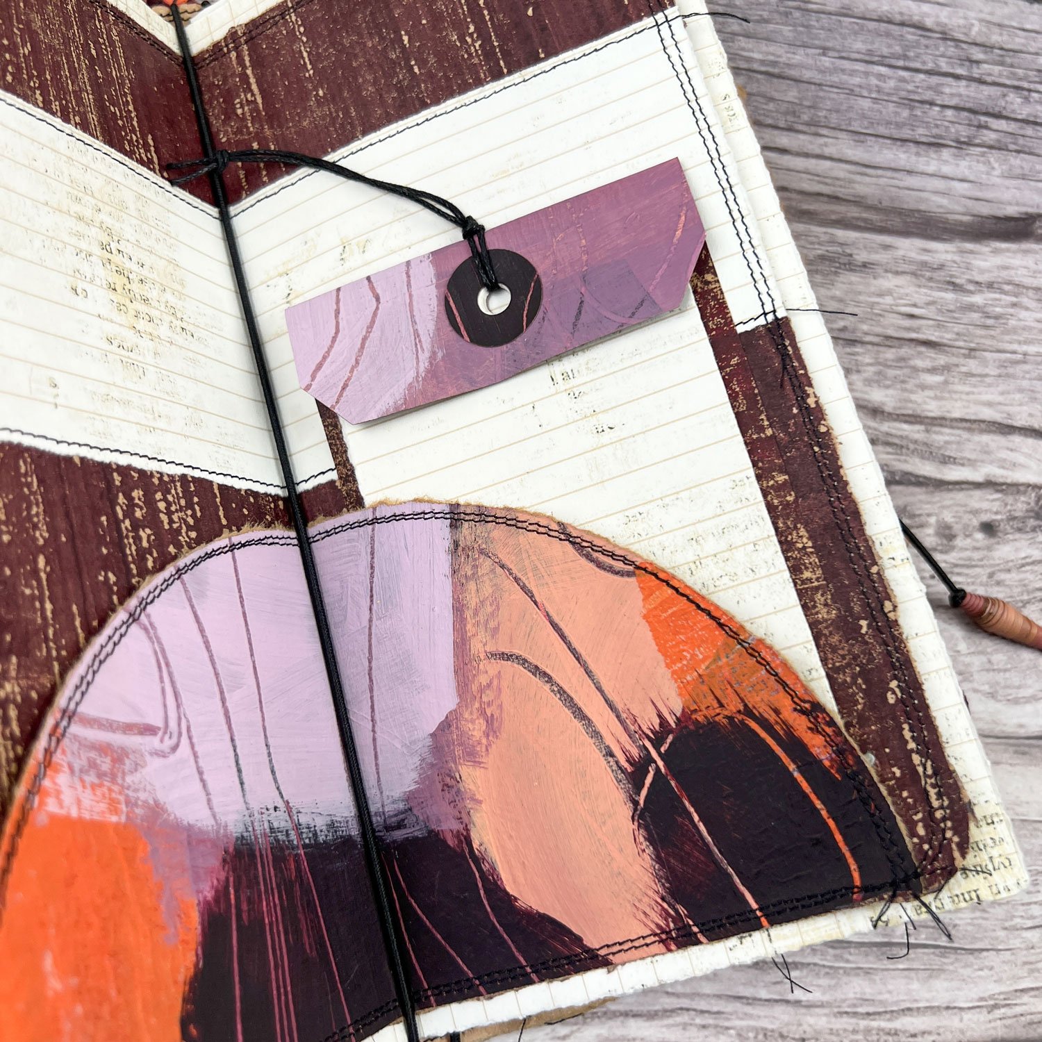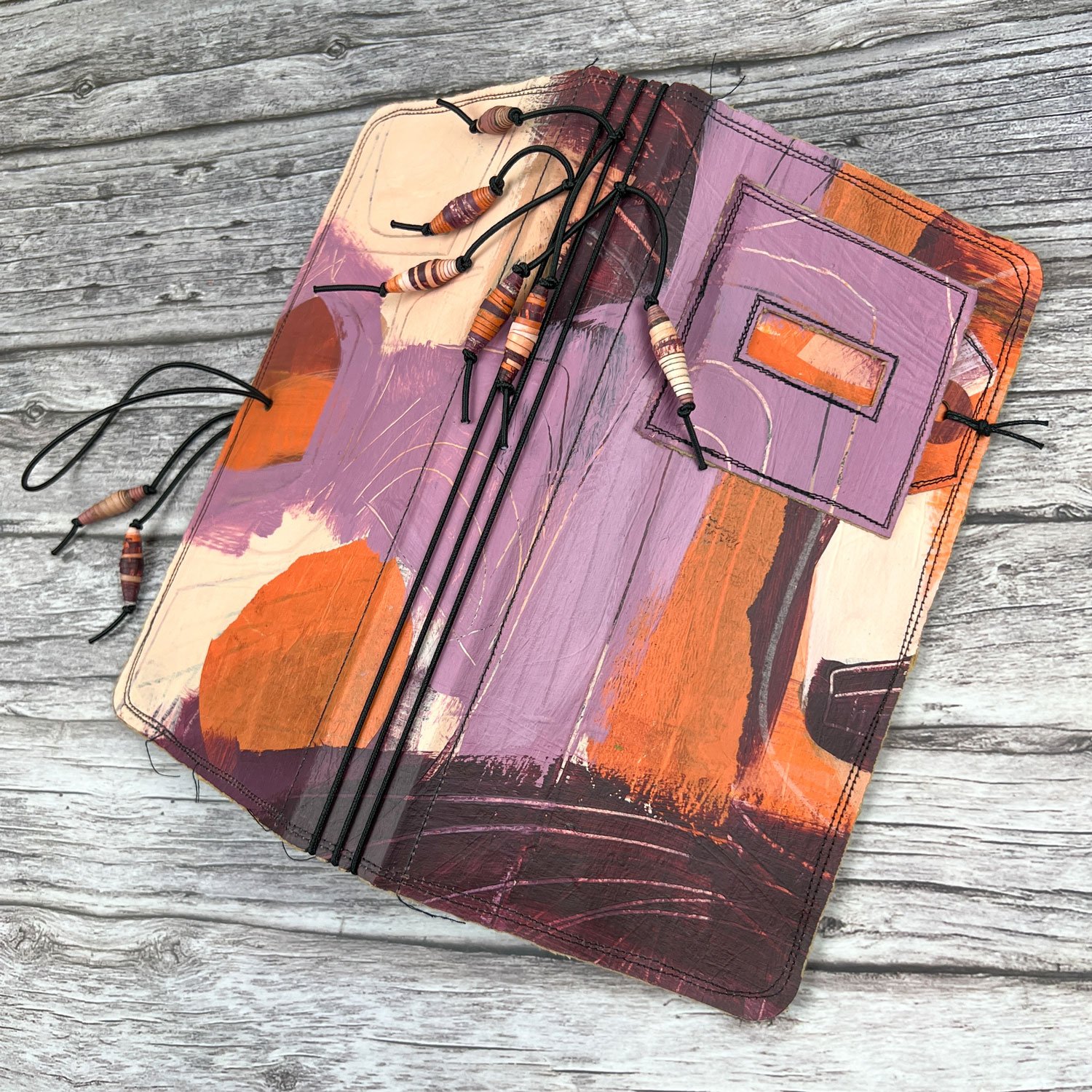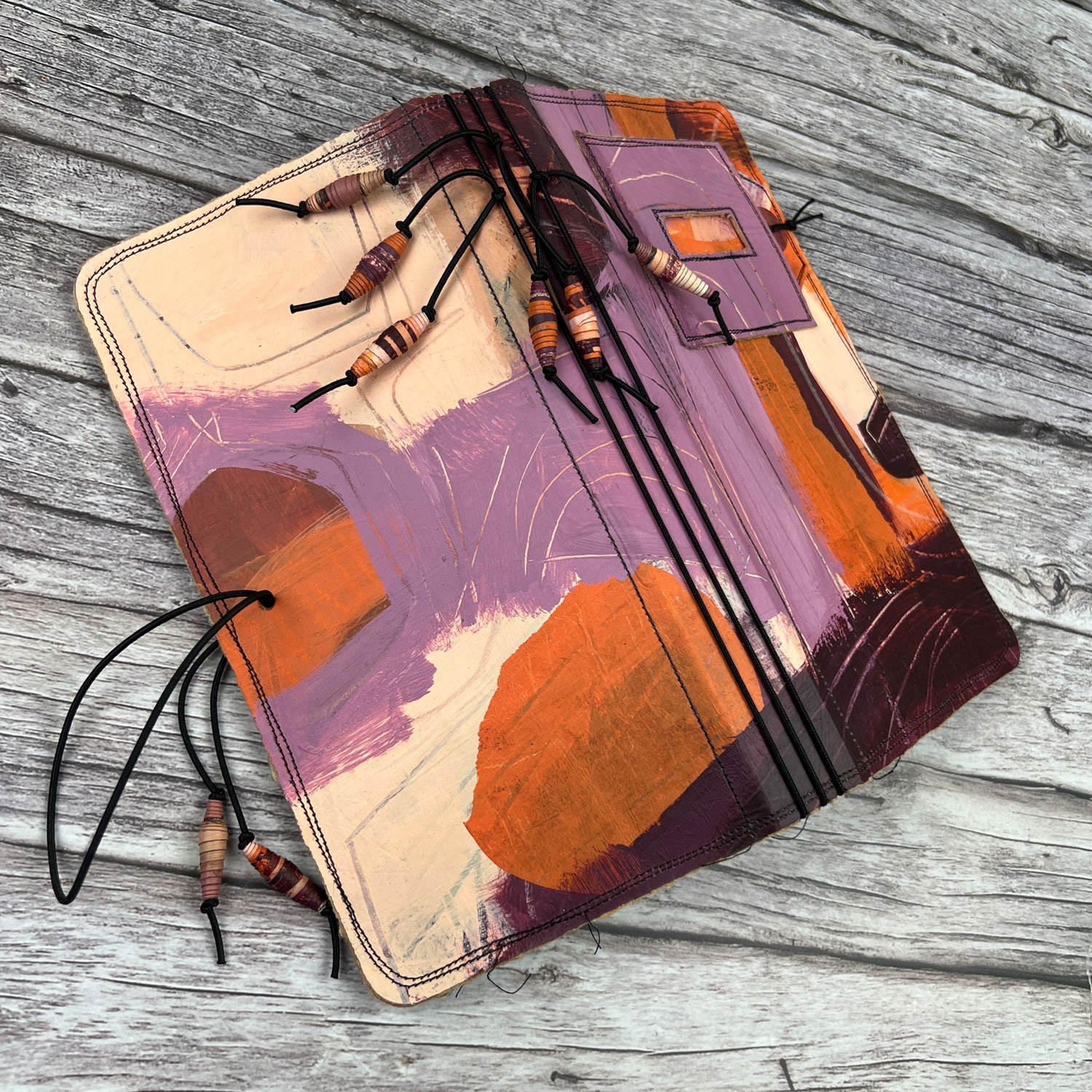 The cover is hand-painted and made from three layers of distressed, stitched-together brown paper bags, giving it a beautifully worn and organic feel. Flexible yet durable, the cover expands as you fill the pages. The pages are elastic bound making them easy to remove, rearrange, and work on outside of the journal. Elastic binding features paper bead accents. A simple black elastic closure holds your thoughts and inspirations securely inside.